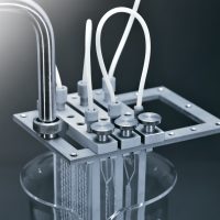 The inexpensive MR-Lab series was developed for laboratory syntheses. It permits the simple translation of an intermittent work method into a continuous one using standard laboratory equipment. The temperature regulation is carried out as required in temperature adjustment vessels, on hotplates or in cold mixtures. The microreactors are connected by means of a connecting bar with 1/4“ UNF 28 fittings. An optional additional frame accepts the connection bars together with the reactors. If a constant temperature is required over the entire frame including hoses and reactors, the entire frame can be immersed to the top of the hoses.